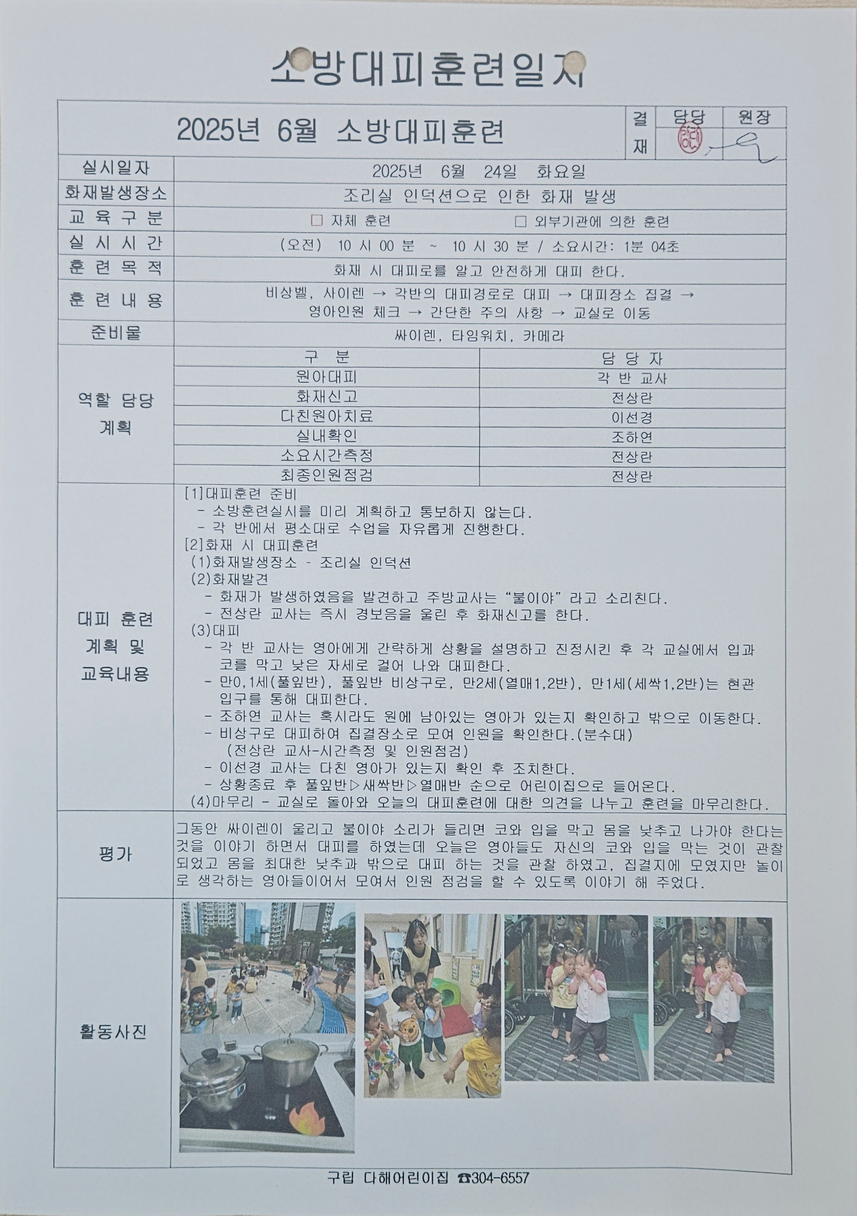 | 소방대피 훈련 여부 | 실시 | 훈련일자 | 2025-06-24 |
