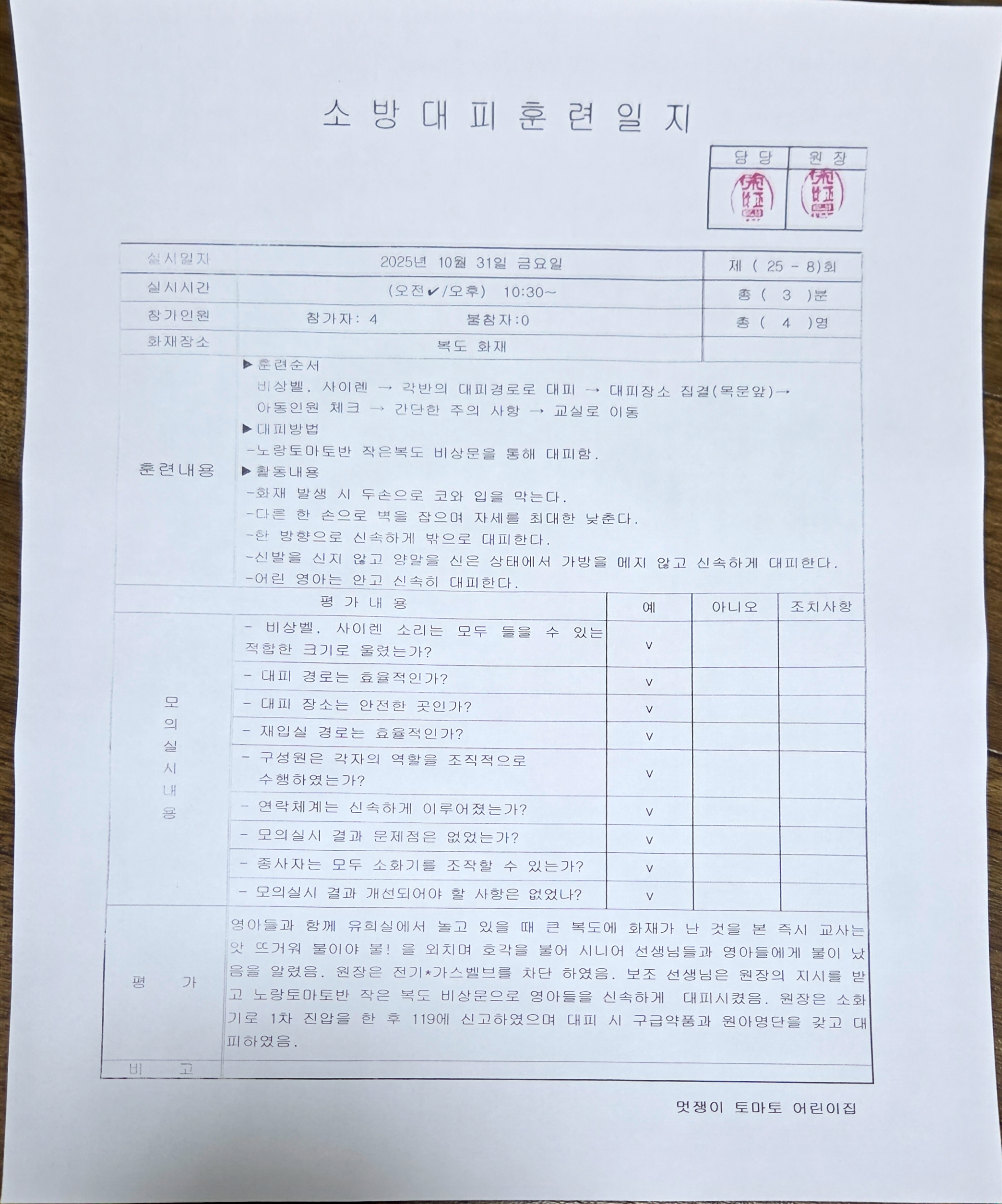 | 소방대피 훈련 여부 | 실시 | 훈련일자 | 2025-10-31 |